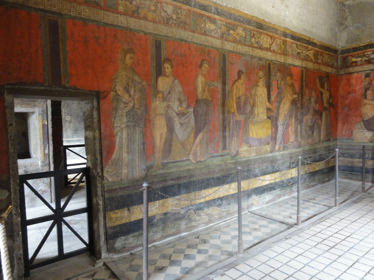 ポンペイ遺跡の中心市街からはずれており少し歩きますが見応えのある遺跡です。ポンペイレッドと呼ばれる赤い絵具で描かれた儀式の壁画が沢山あって、独特の雰囲気です。個人旅行で行ったので解説無しでの見学でしたので、内容は判りませんでした。
