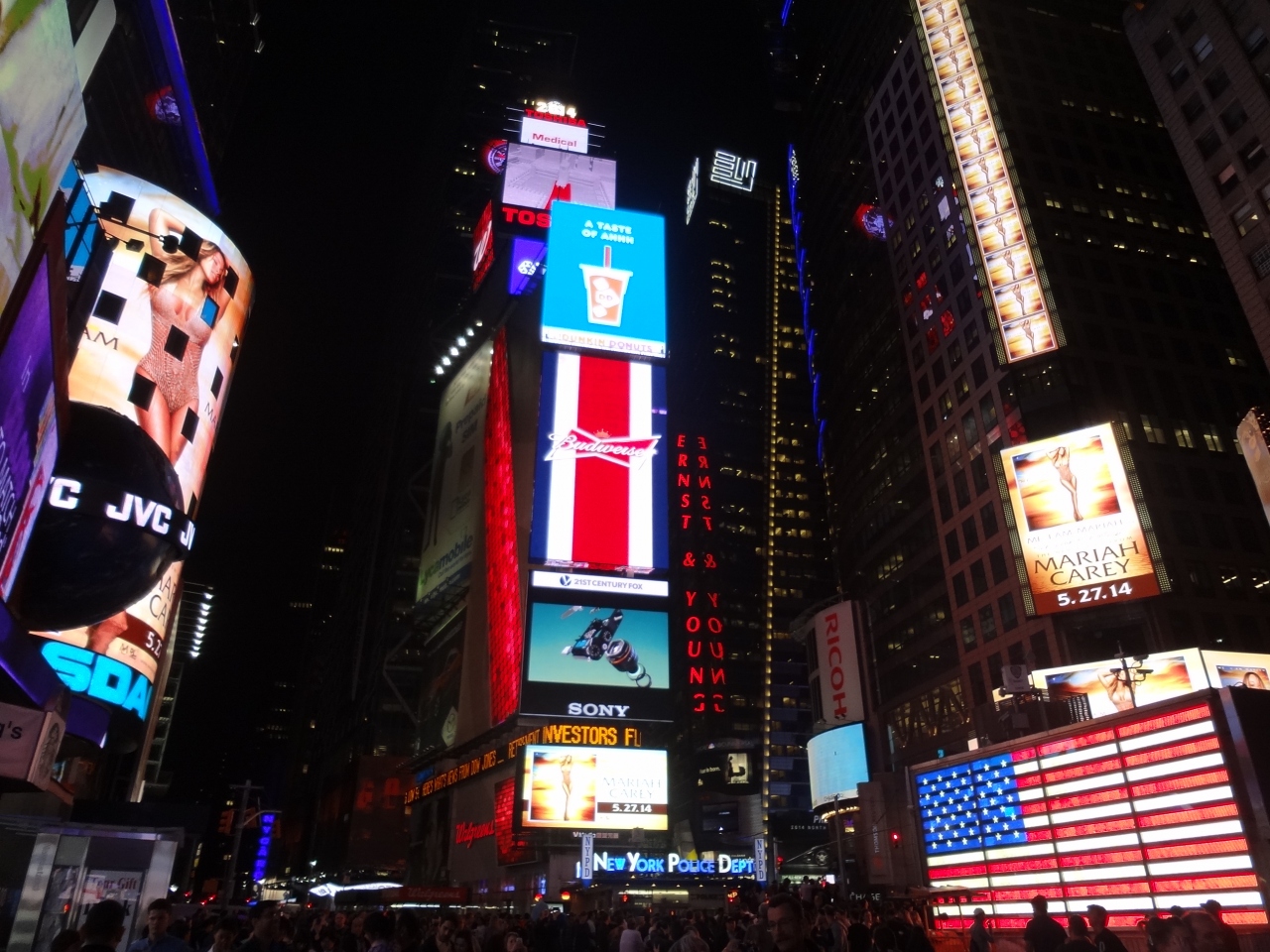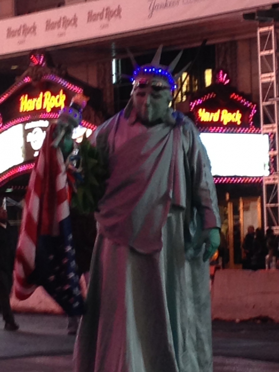 何時に行っても人が多いタイムズ・スクエアはニューヨーク観光の中心だと思います。各建物は24時間照明を消してはならない条例があるとのことで、夜10時過ぎでも、ガイドブックが楽に読めるほど明るく、治安の心配はありませんでした。 あちこちに自由の女神、スパイダーマン、戦隊ヒーロー、スポンジボブ、その他ゆるキャラがおり、写真に入ってチップをねだっていました。 晴れた昼間の44丁目付近では有名なネイキッド・カウボーイの黒人版と老婆版(上半身裸でした...)がおり、特に後者は見ない方が良かったとちょっと焦りました。