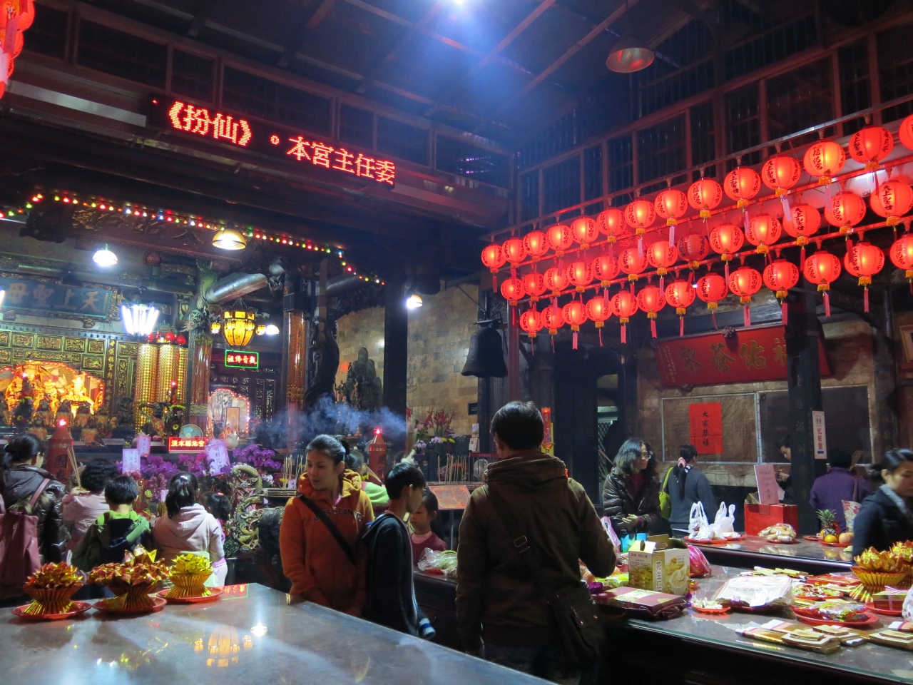 淡水の街を見守る海の女神・媽祖様を祀る宮です。淡水老街の中心部に位置し、地元の方、観光客、多くの参拝客がひっきりなしに出入りしていました。特に旧正月シーズンは、初詣客も加わるので、絶えずもくもくと煙るお線香の煙で目が痛くなるほどでした。