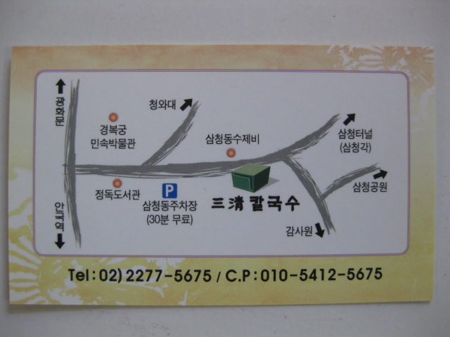 三清洞の青瓦台の近く。えごまが大好きなので、有名なすいとんを注文。一緒についてきたキムチ。今までソウルでいろいろ食べた中で、私には一番おいしく、何倍もオカワリして朝からお腹一杯になりました。日本語は全く通じません。