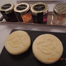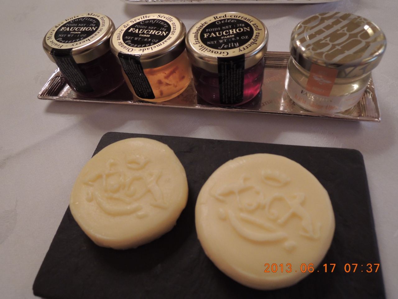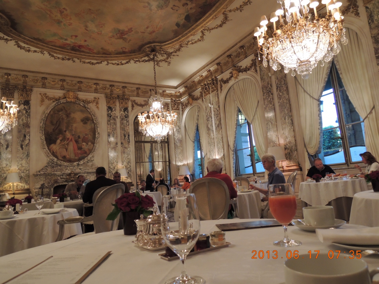 優雅な宮殿にでもいるようなレストランでとてもリッチな気分で朝食をいただきました。朝食付きで宿泊したので宿泊代に朝食が含まれていたのですが、メニューを見たら私達のいただいたアメリカンブレックファストは Au Buffet American breakfast 55€ と書かれていました。席に着くとフレッシュジュースは何がいいか聞かれ、コーヒーと紅茶のどちらがいいか聞かれ、コーヒーはポットで来ました。(普通紅茶はポットで来ますがコーヒーがポットで来るのはハワイのホテルとペニンシュラホテルのザ・ロビーだけしか知りません。)フレッシュジュース、超美味しい!すぐにパンがどっさりテーブルに置かれこのパンはラロスのパンでした。テーブルに置かれているバターにはホテルのロゴが入っていてジャムはフォション、マスタードはディジョンでした。