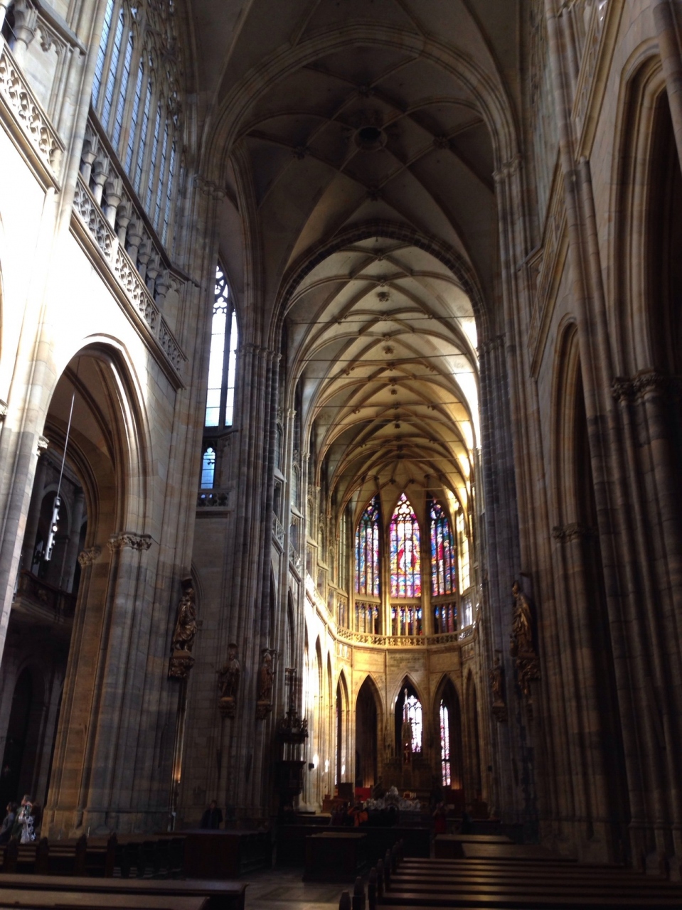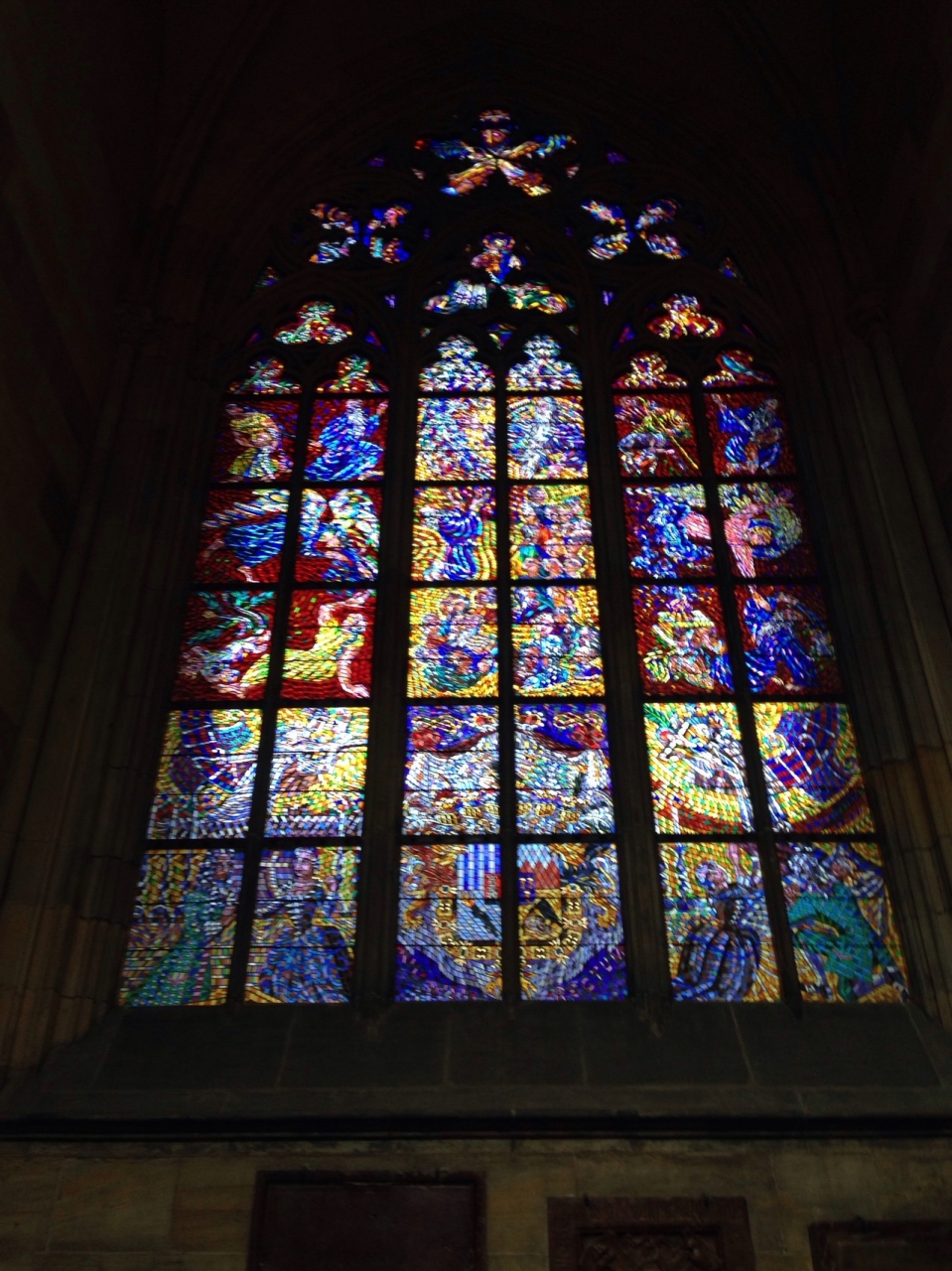 プラハ観光では外せないミュシャのステンドグラスが有名な大聖堂ですが、そのほかのステンドグラスも細工の素晴らしいものばかりで一見の価値ありです。ただプラハの主だった観光スポットは何処でもそうですが沢山の観光客で混んでいて私はお昼頃にいったのですが入るのに少し並びました。