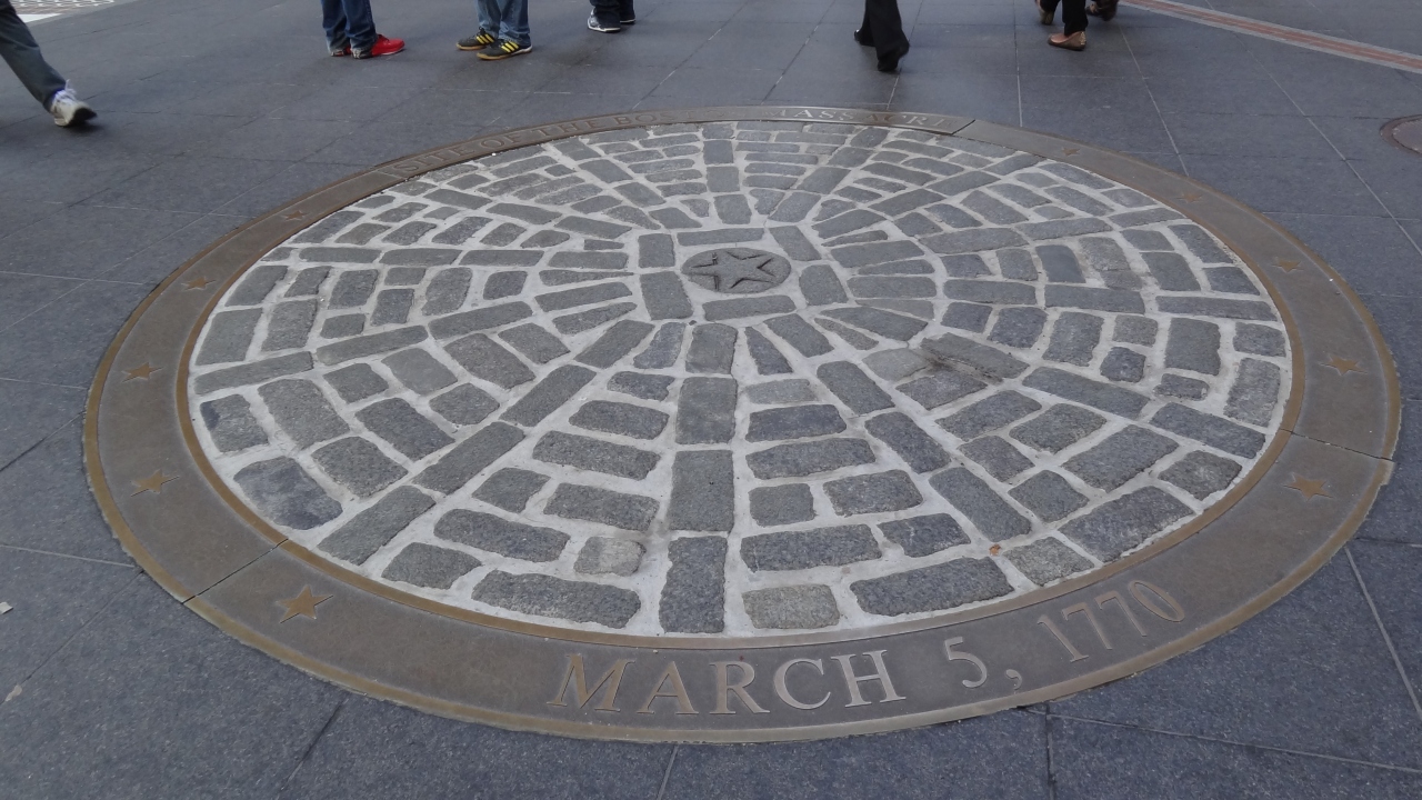 ボストン虐殺地跡は、ボストンで人気の史跡を巡るウォーキングコース、フリーダムトレイルのコース内にあります。旧州議会堂のすぐ脇にあって、たくさんの人が行き交う道路に円形の印がついています。イギリス軍と植民地側の市民の間の切迫感を強く感じる場所でした。