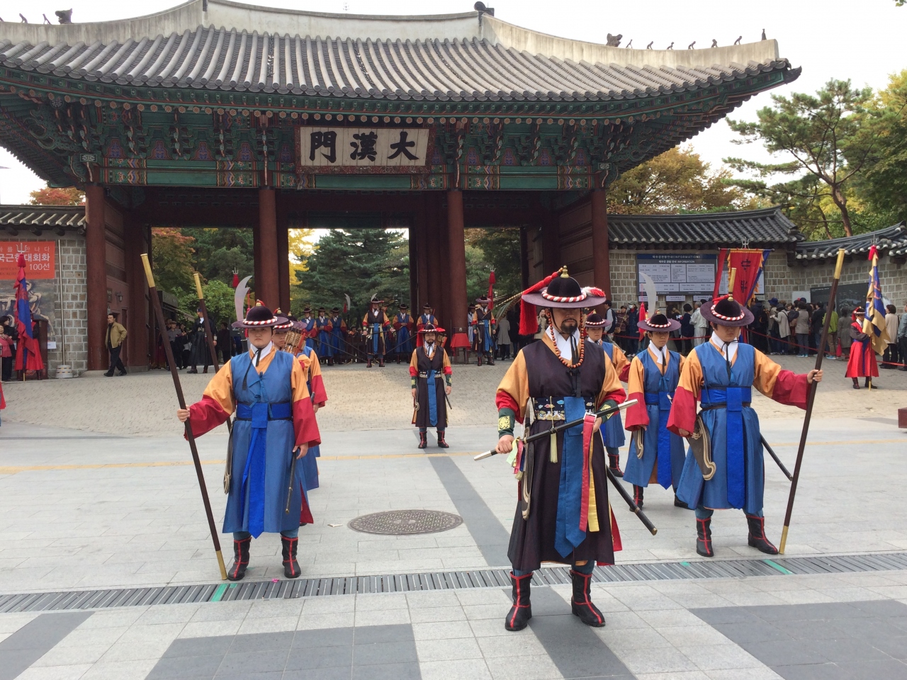 伝統衣装を来た守門将たちが行列になって脇の道から出てきて、
