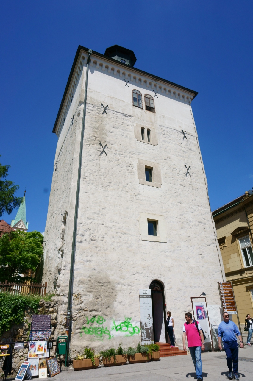 世界一短いと言われるケーブルカーを乗り場のすぐ目の前にあるロトルシュチャク塔に登るとザグレブの街を見渡せる展望台があります。エレベーターがなく階段でビルの6階ほどの階段を登らなければなりません。1階にはお土産ものを販売する売店とチケットオフィスがあり、塔の中間階には12時を知らせる大砲が設置されています。塔を登る途中立ち寄れる各階にはザグレブ、クロアチアの資料が展示されており、そちらも興味深かったです。