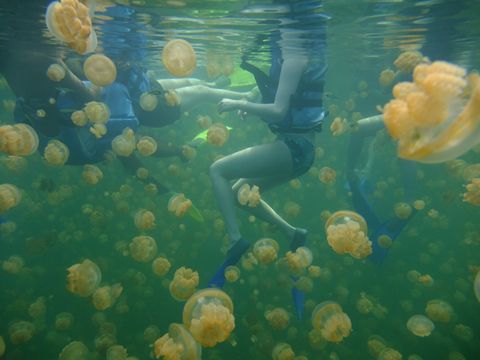 個人では行けないので、現地主催のツアーに入る必要がある。ジェリーフィッシュレイクに立ち入るには、100米ドルの立入許可証を買う必要があるが、それだけ払っても行く価値がある。船から降りて、少し山道を歩くとこの湖に到着するが、湖岸でライフベストとシュノーケルとフィンを装備し、中央に向かって泳いでいくと無数のジェリーフィッシュ(くらげ)が泳いでいる一角に到着する。無数の大きいクラゲや赤ちゃんクラゲが泳いでいて、手に取ることもできる。長い年月を経て、ここのクラゲは刺さないので、安心して手にとることができる。無数のクラゲが泳いでいる様はこの世と思えないほど感動的である。パラオ観光では絶対はずせないポイントである。カメラを持ち込むことができないので、写真が撮れないのが残念であった。