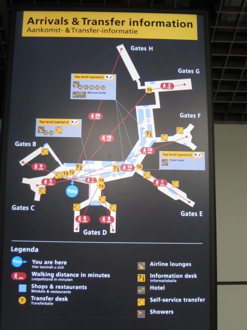 この近くのホテルを使っていたこともあり、とてもお世話になった空港です。飛行機を降りた後はかなり歩きましたが、手荷物を取るまでの通路にもチューリップのお店などたくさんあり、飽きませんでした。外に出るとレストランやスーパー、雑貨屋さん、フリッツ屋などがあり、便利でした。インフォメーションは真ん中にありました。