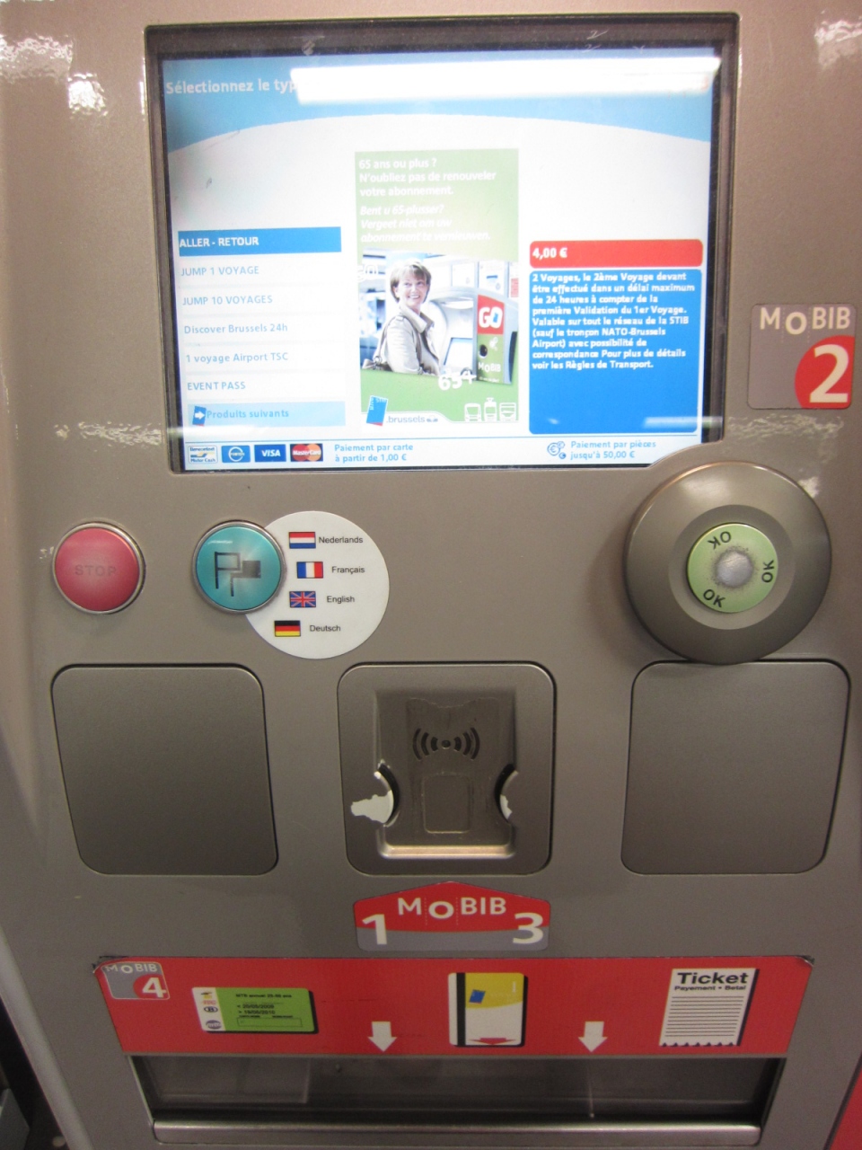 荷物が多かったのでブリュッセル南駅からホテルの側の3駅の往復を何度か利用しました。1回分のチケットは高いと思いましたが、回数券を買うほど乗らなかったのと、安い5回券を買うには有人チケット売り場が混んでいたので結局、自動販売機で購入しました。その自動販売機の言語を変えるやり方がすぐには分からず、苦戦。案内はあるんですが、読むこともなくやっていたのがいけないのですが、銀の丸い少し大きめのボタンがあるのですが、そのボタンを回して替えるというものでした。この方法の券売機は初めてでした。機械によってはボタンがめり込んでいて反応が悪いので、そのときは替えたほうがいいです。それ以外は案内にそっていけば買えました。