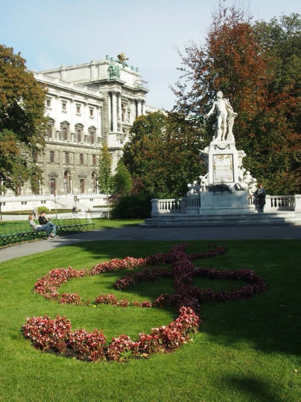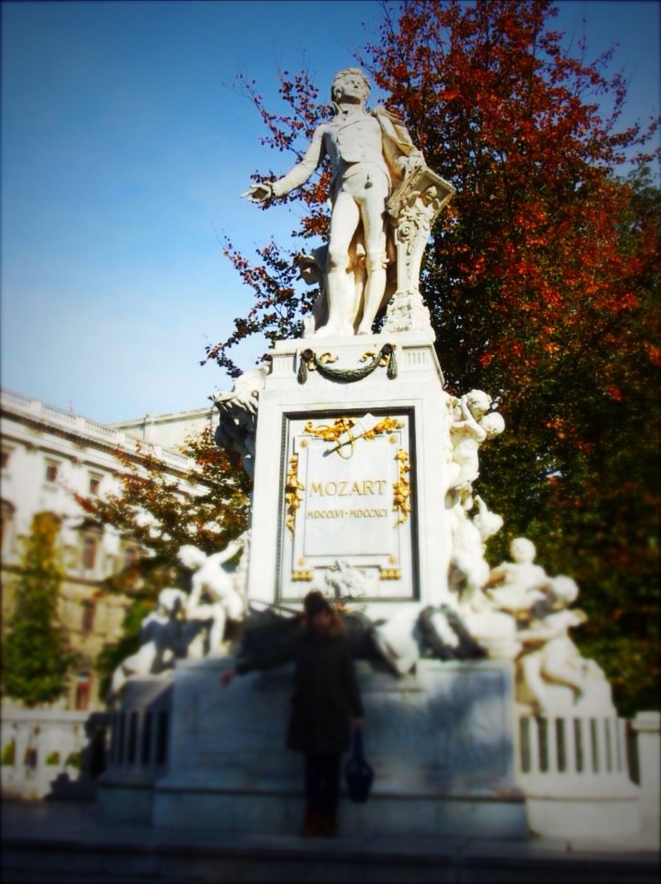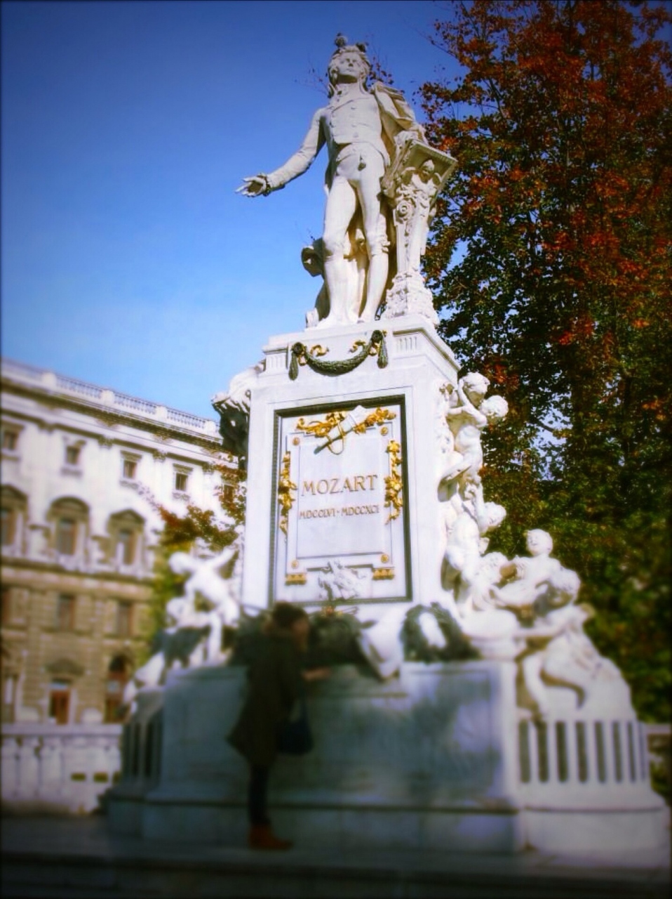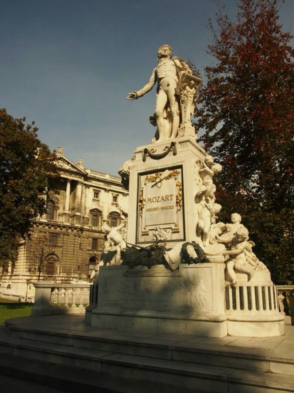 モーツアルト像の下段にはピアノやトランペットやヴァイオリンなどが
