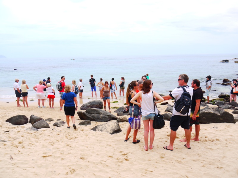 午後のほうがホヌに会える確立が高いとのことで1時ころにいきました。ホヌは岸近くで泳いでいましたが、ひとがたくさんいたせいかなかなか上陸はしてきませんでした。30分近く粘りましたが、甲羅干しの姿は見ることはできませんでした。会えたらラッキーだと思います。