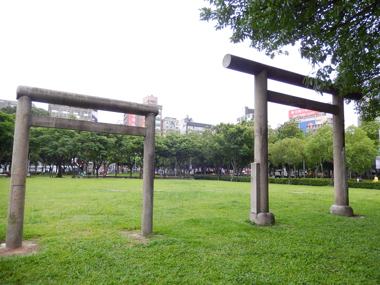 歓楽街の林森北路に面し、晶華酒店や老爺酒店など日本人宿泊客も多いホテルに隣接する林森公園に、大小の2つの鳥居が建っている。公園の隅の方でしかも大きなガジュマルの樹のそばにあるのであまり目立たないが、これは第7代台湾総督の明石元二郎氏とその秘書官であった鎌田正威氏の墓前に建てられていたものだそうだ。この地は日本統治時代は共同墓地だったが、中国大陸から敗走してきた国民党の避難所となってバラックが建ち並び、その整備のため、遺骸は台北県三芝郷の福音山基督教墓地に、鳥居は二二八公園へ移され、鳥居だけが2010年10月にここに戻ってきた。広い芝生の公園に建つ鳥居は今は場違いな雰囲気だが、死後は台湾に葬るよう遺言を残していた明石元二郎氏と、彼を偲んで寄付金で墓所を建てた台湾の人々との友好の歴史を物語る遺構となっている。