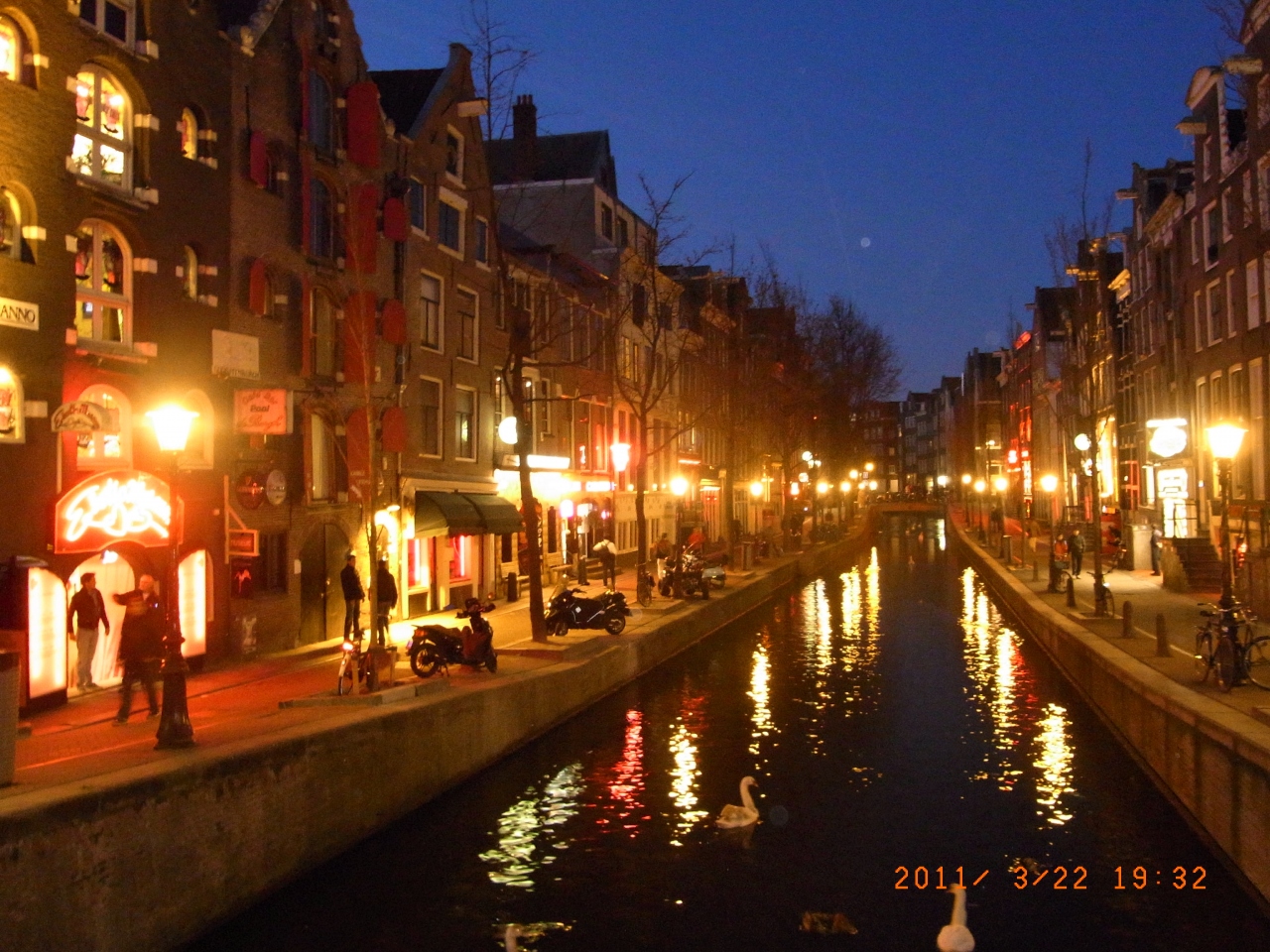 日が暮れ、あたりに夕闇が迫った頃、ニューマルクト広場からアムステルダム中央駅に向かうときにこの辺りを通った。ガイドさんから、彼女たちの仕事はオランダでは合法の仕事と聞きびっくりしたのだが、駅に行く近道だったので通りぬけするつもりで歩いていた。するといきなり明かりがついて、反射的にそちらに目をやると、光る下着をつけた女性と目があってしまった。とっさのことでびっくりして足早に通り過ぎたのだが、暗闇でも光って目立つようにああいう下着をつけているんだなぁと、なんだか見てはいけないものを見てしまったような気がした。