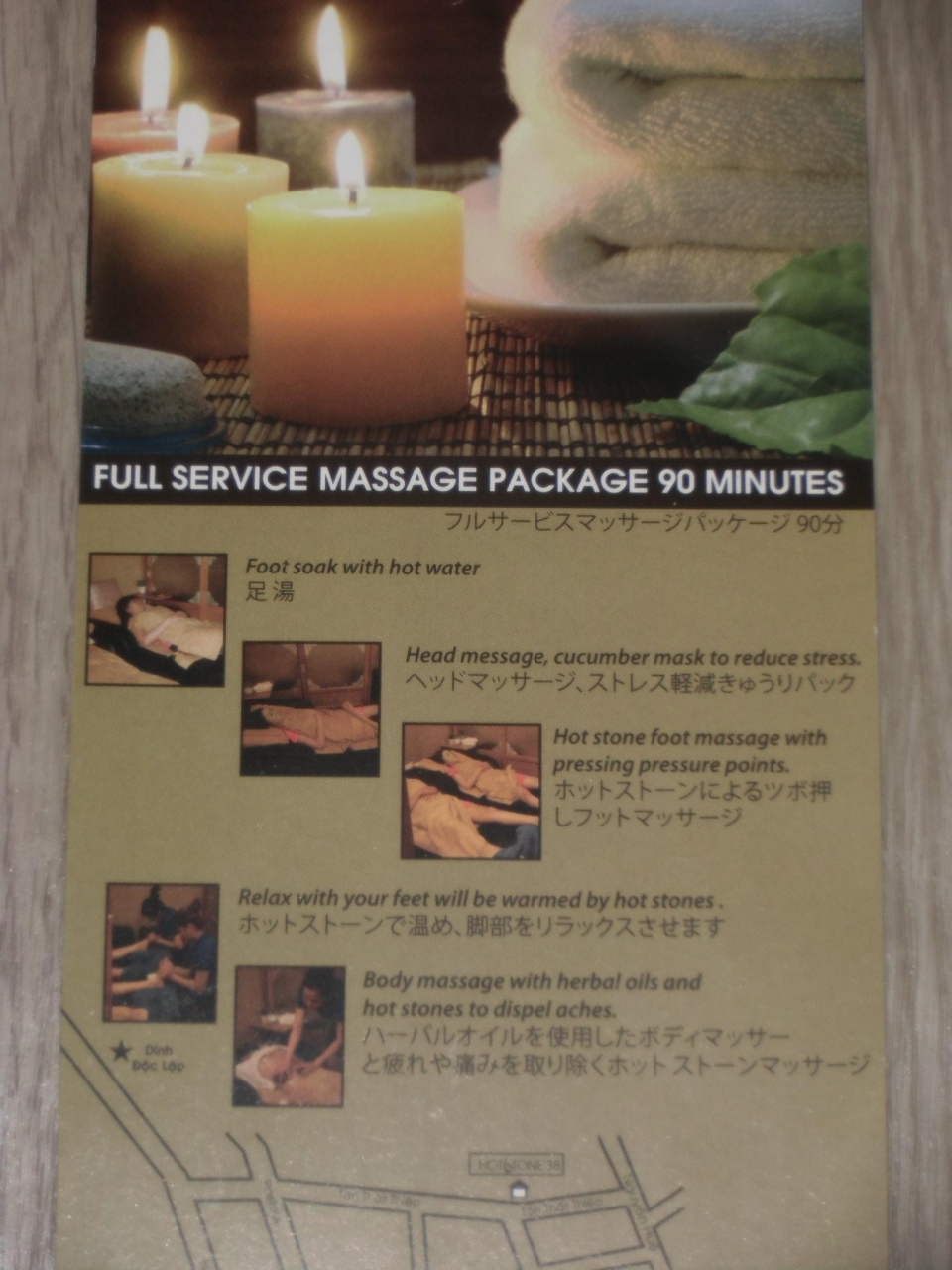 2014年6月16日~7月15日までは、全てのコースが20%引きですので、60分のフットマッサージが20万ドン→16万ドン(チップ込)など、とても安くなっています。