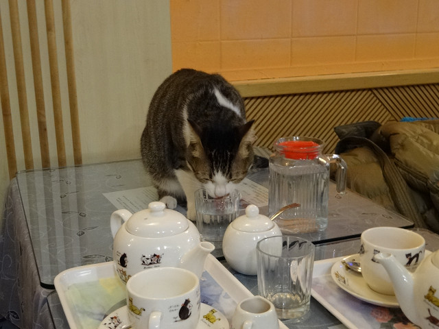 お客さんの水を勝手に飲んじゃう猫ちゃんもいて、かなり自由