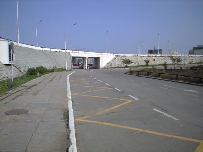 出発階へ上がる道路の下を潜ります。潜ったら、右へ。(写真2)