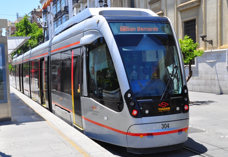 市庁舎前のヌエバ広場からサン・ベルナンド駅までの比較的短い路線ですが、沿線にはカテドラル、アルカサル、サンタ・クルス街、スペイン広場などの観光名所があり、観光客には便利。近代的なデザインで、車内も清潔で快適です。