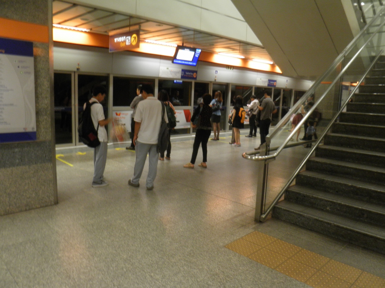 バンコクのアソーク通りとスクムビット通りの交叉するところに、ターミナル21というショッピングビルがあって、ここから地下鉄のスクムビット駅に降りました。 エスカレーターが長くて、セキュリティチェックがあります。 警報がなると鞄の中をチェックされました。 駅には券売機が2か所あるけど、スクムビット通り側はけっこう混雑していました。