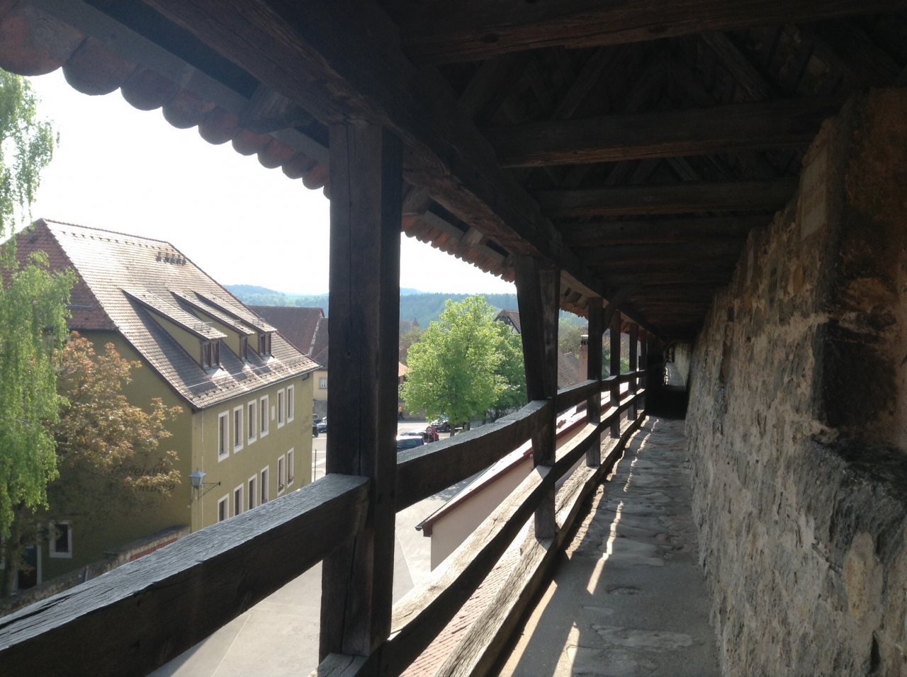 ローテンブルクの旧市街を、ぐるりと城壁が取り囲んでいます。所々に階段があって、昇降できます。中世そのままといった風情で、古めかしく狭い通路です。歴史を感じるとともに、上から町を見下ろすことができ、楽しかったです。