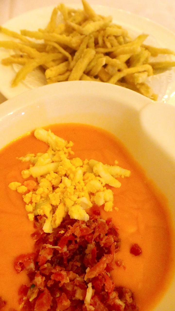 メニューには魚料理も肉料理も美味しそうなのが並んでいたのですが、私はコルドバ郷土料理メニュー(19ユーロ)を頼みました。