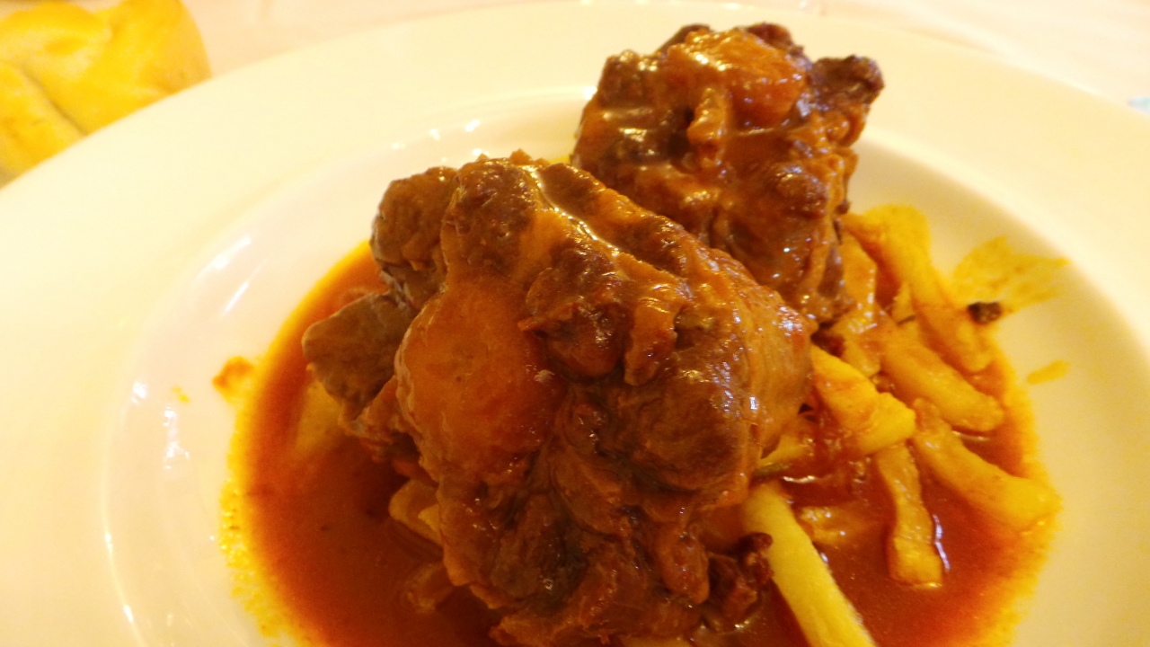 前菜にはサルモレホと茄子フライ、メインにはオックステール。
