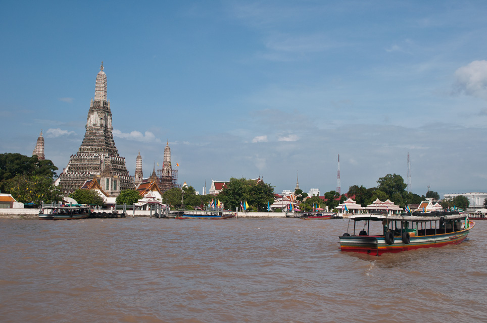 川の水は、ぶっちゃけ黄土色に濁ってきれいではありません。しかし、暑いバンコクでこうやって水の上を突っ切っていくのは、とても清涼感があります。やがて左手に王宮、右手にワット・アルンという寺院と、バンコクを代表する建築物が見えてくるなど雰囲気も良く、格安ながらも贅沢なプチクルージングになりました。