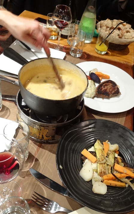 チーズフォンデュは本場だけあって非常に美味。リゾットも美味しくワインと合う。ステーキは少し硬かった。