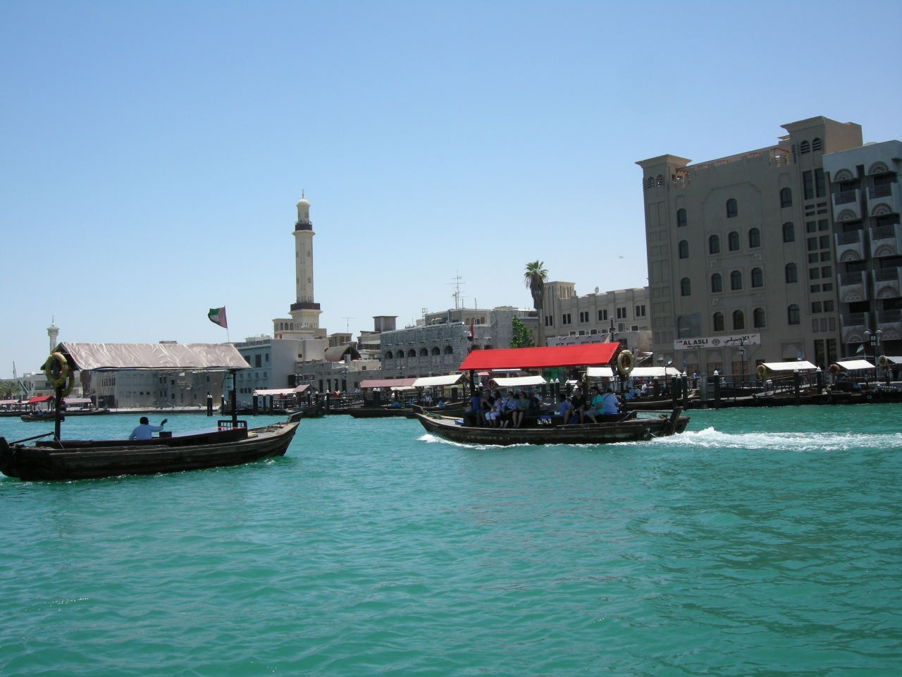 ドバイクリークを渡るための渡し船です。団体ツアーでドバイを回ったので船は貸切でした。観光客相手の船なのか、地元民の足にもなっているのか、よくわかりませんが、観光としては特に面白いわけでもなく、向こう岸まで5分くらい船に乗っているだけです。