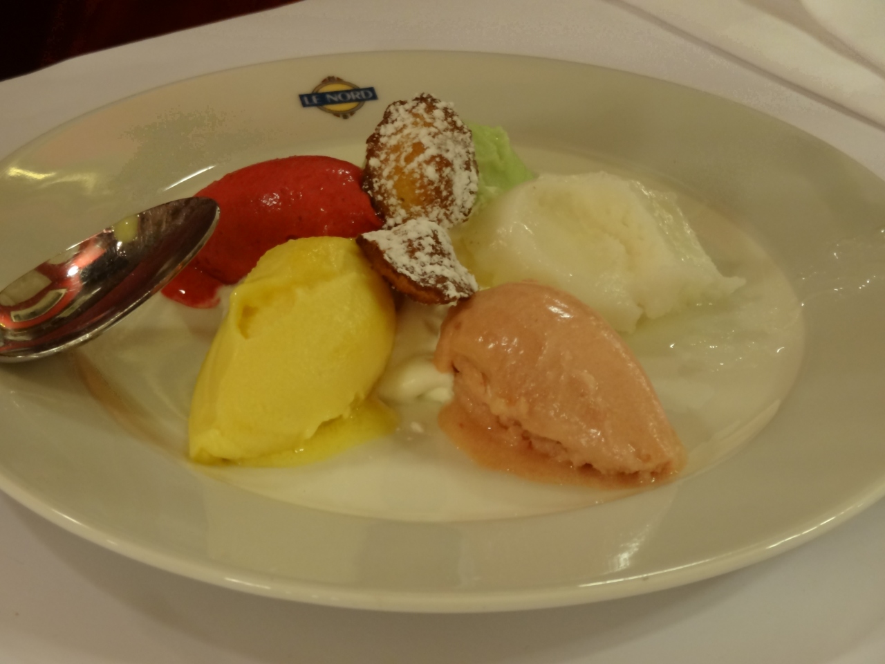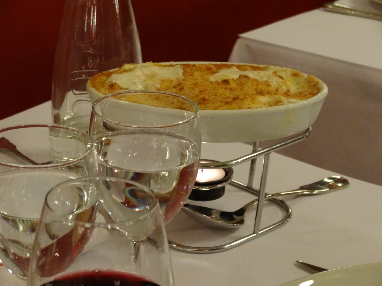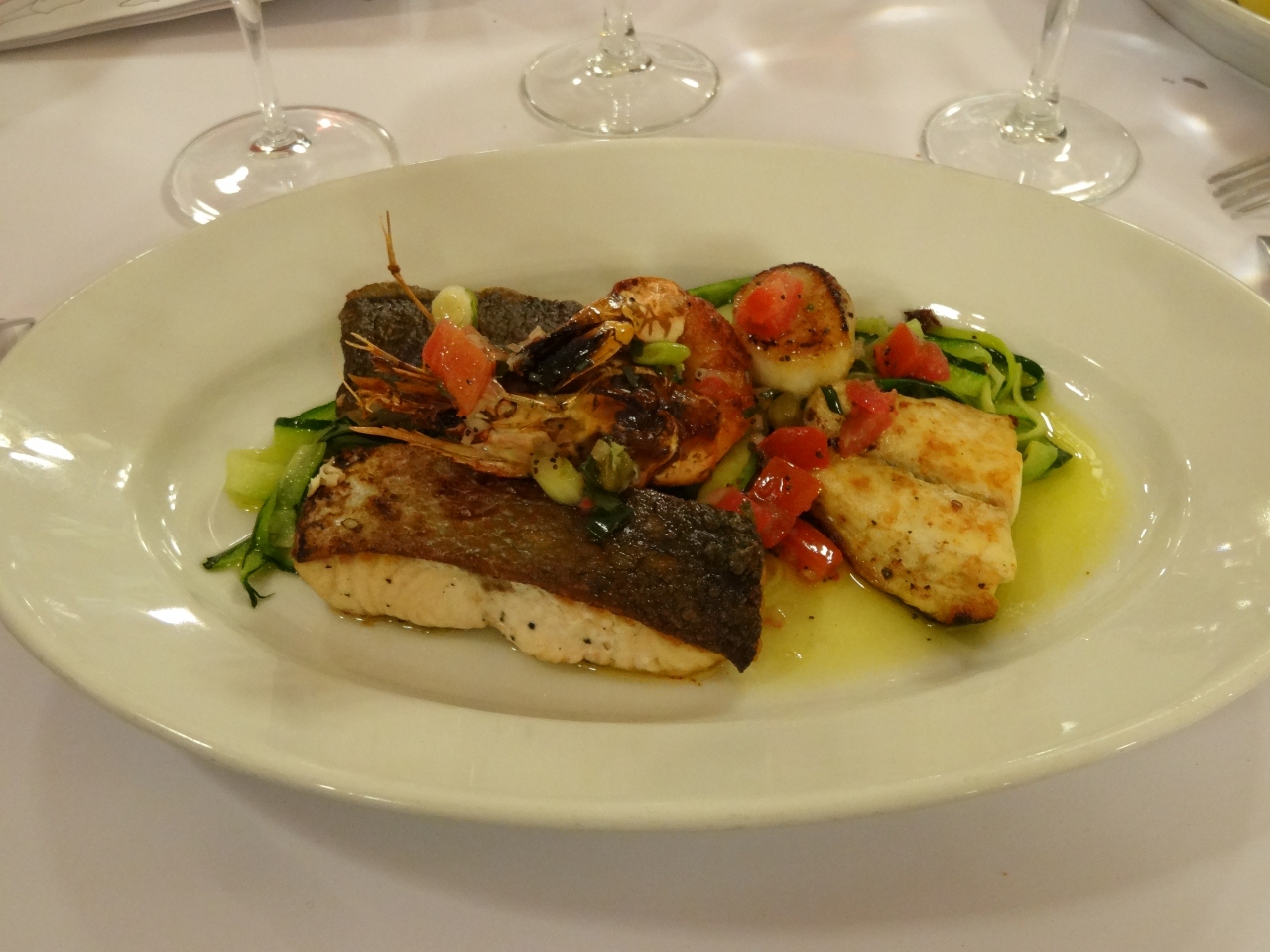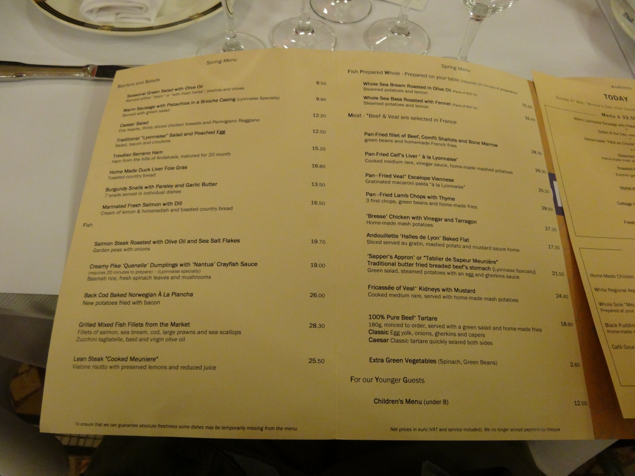 メニューは英語表記有り。注文したのは、リヨンスペシャルの牛の胃のカツレツ、魚介類のグリル、子牛のカツレツ・マカロニグラタン添えの3種だったが、どれも美味。