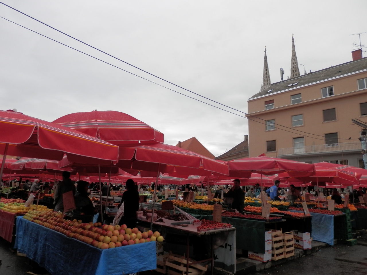 広場から行くと10段くらいの階段の上なので見逃すかもしれない。階段の上におばさんの像があるのが目印。大聖堂の方からだと赤いテントの屋台が美しく数も多いので目につく。石の門、モザイクの紋章の教会、歴史博物館他の見所が固まっている。