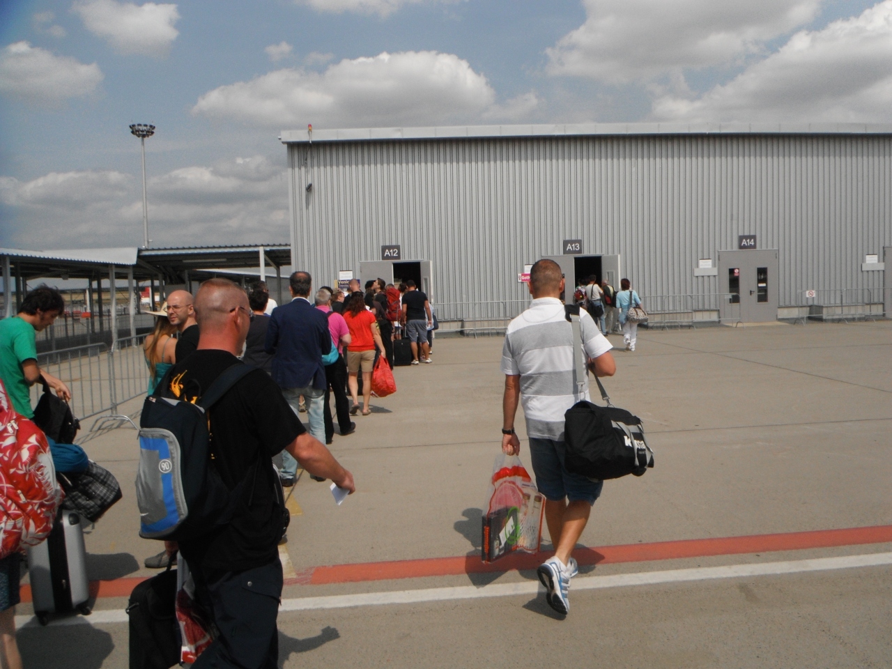 ターミナル自体は大手のキャリアと同じ、手荷物検査を済ませてから、格安系専用のゲートまで10分ほど歩くことになります。格安系の搭乗口にはお店らしいお店がないので、買い物やお茶をするなら搭乗時間間際まではターミナルで待った方が無難です。到着も同様に歩くので、天候次第で雨具が必要です。