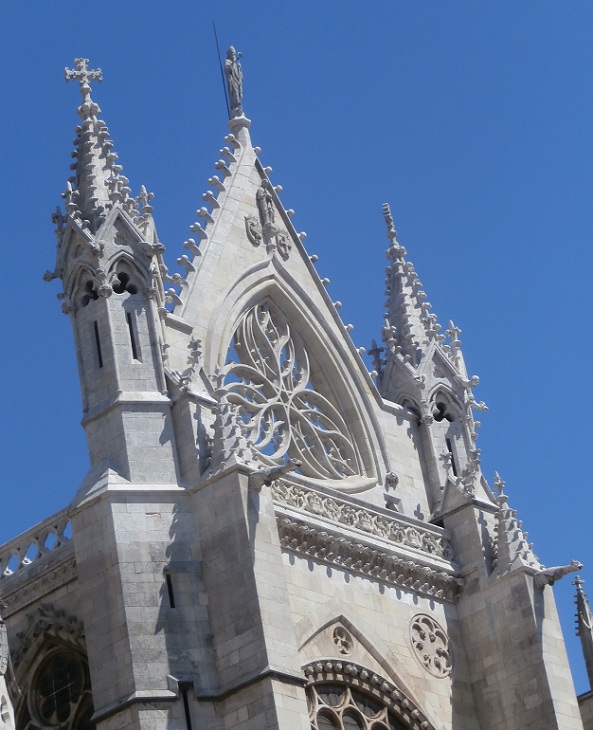 フランス的なゴシック建築だけに、すっきりと洗練されたラインの外観。特に、アンチャ通りを歩いてきて広場に着き目に飛び込んでくる斜め正面の姿は、空にすーっと伸びるラインに惚れ惚れ。
