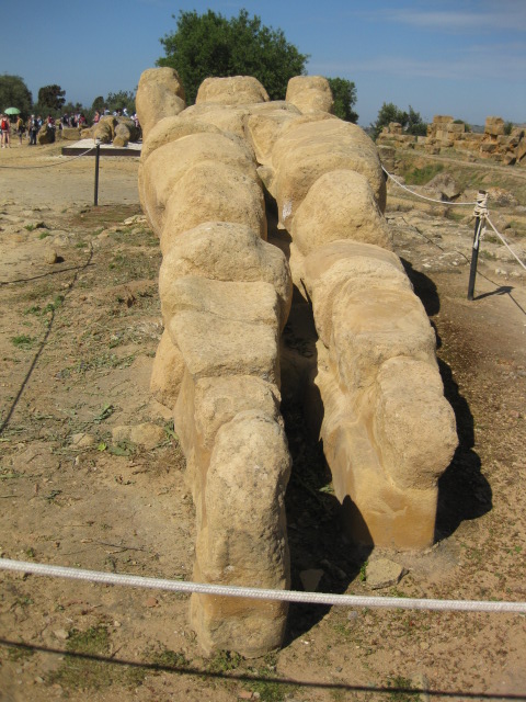 神殿を支えていた巨大な人像の柱であるテラモーネの模造品が横たわっています。実物は国立考古学博物館に展示されているそうです。もともとこの神殿は古代最大のドーリア式神殿になるはずでしたが、カルタゴの襲撃を受け、その後も地震があり、廃墟と化したそうです。ゼウス地区入ってすぐにあります。