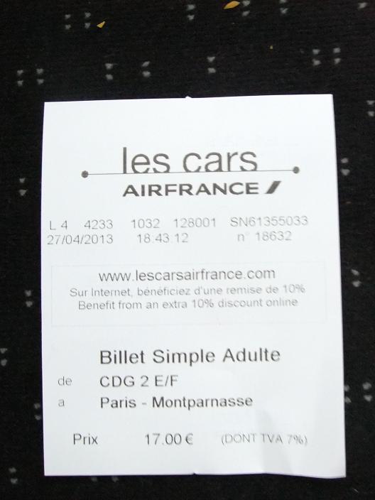 エールフランスバスにて市内に行きました。乗り場はターミナル2Eから2Fの通路の外にあり、チケット売り場は出口付近に券売機がありました。乗車時に運転手からも購入ができるので時間のない方は運転手さんから購入したほうが良いと思います。荷物は日本のバスとは違い自分でバスの外側にある荷物入れに入れます。
