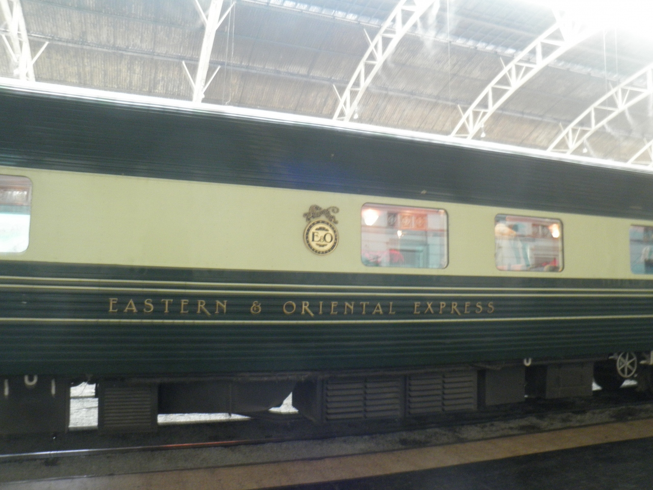 バンコクの国鉄中央駅ファランポーン駅に行きました。 この駅は改札なしでプラットフォームへいくことができるので、自由に停車している列車を眺めることができます。 訪れたときには、豪華高級列車のオリエンタル・エクスプレス号が停車していました。