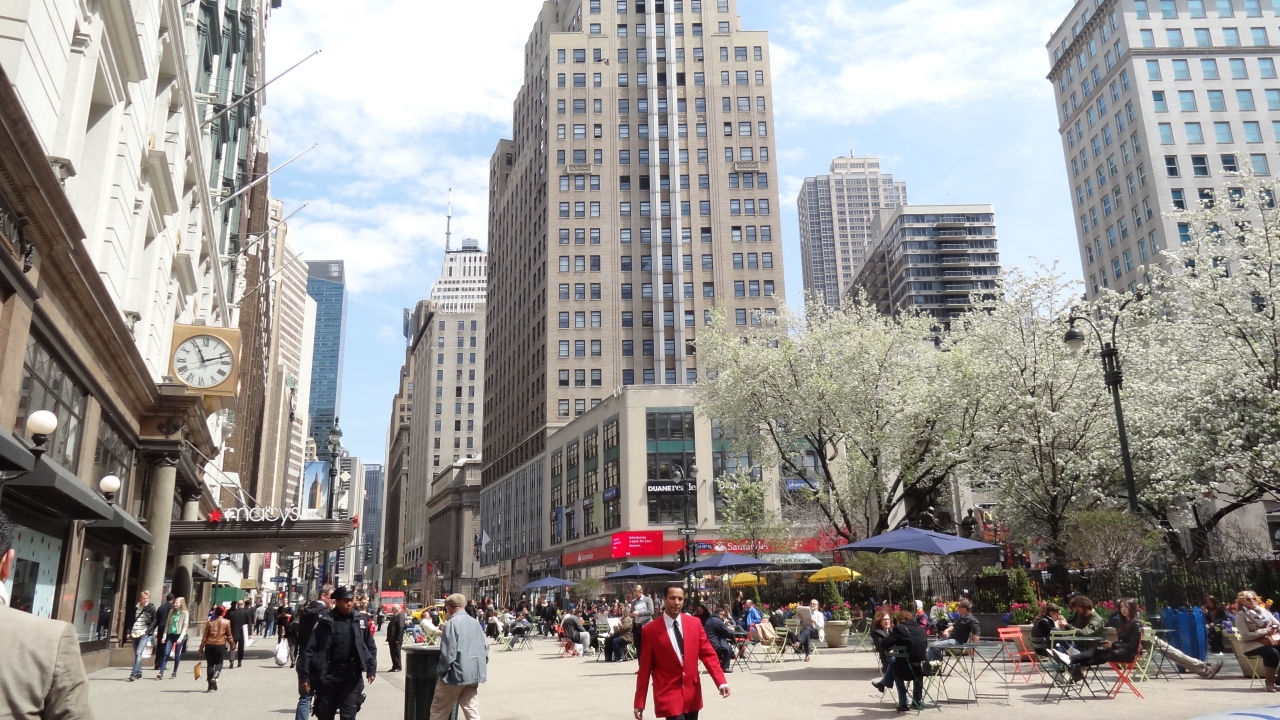 ヘラルドスクエアは、ニューヨークの比較的カジュアルなデパート、メイシーズのすぐそば、エンパイヤステートビルからもそれほど離れていないところにあります。すごく広いスペースではありませんが、椅子とテーブルがあって、緑や花があって、都会の真ん中で落ち着きます。便利な場所なので待ち合わせにもいいですね。
