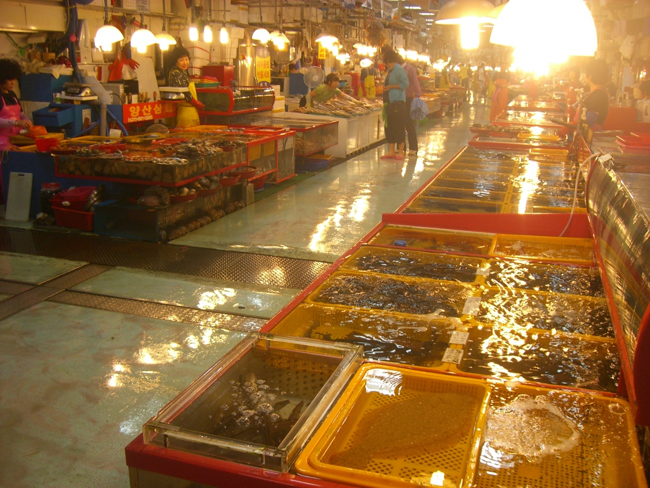 綺麗なビルと内部の魚市場の風景とが微妙にアンバランスです。