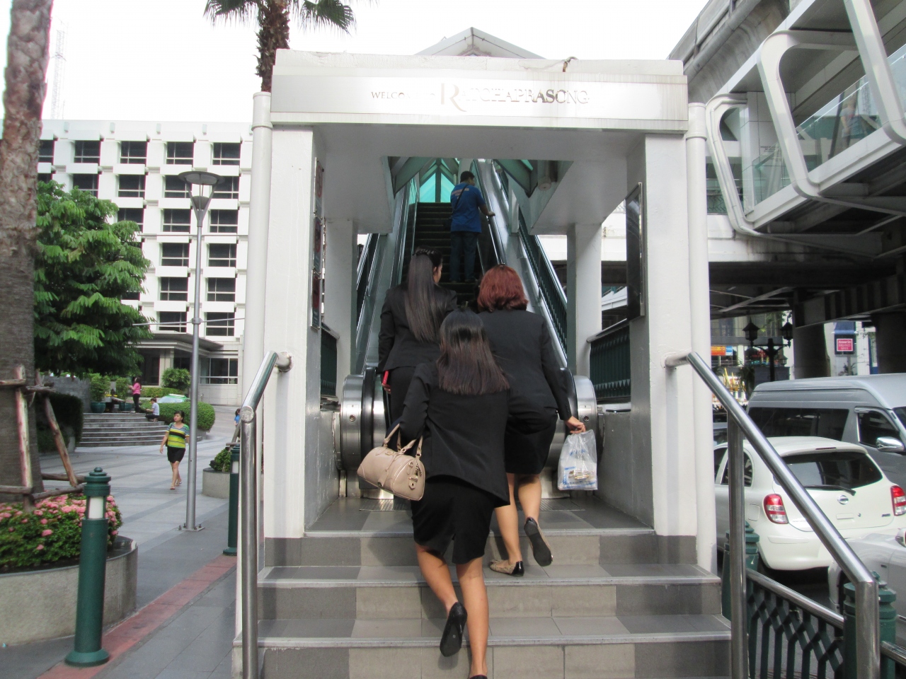 チットロム駅周辺のラチャダムリ通りにあるセントラルワールド、ゲイソーン、BIGCへのアクセスに利用します。BTSの下を通っているスカイウォーク(歩道橋)があり、スクンピット通りからはエスカレータが設置されています。駅に戻るのも便利です。