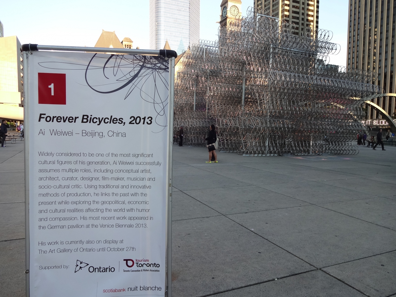 今回訪れた際は、AGOのAi Weiwei展とリンクして、彼の自転車をモチーフにした大きなインスタレーションが飾られていました。夜のライトアップも幻想的でした。