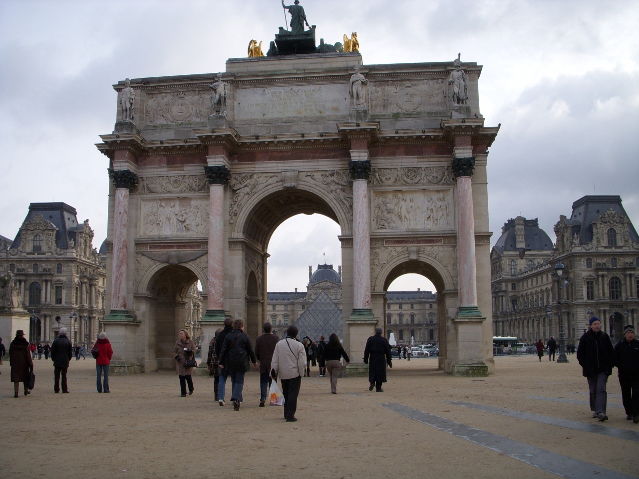 ルーブル美術館につながる凱旋門です。こちらをくぐって庭園や美術館につながるわけですが、あの凱旋門とは違ってすこし小さく、薄ピンクしたものでしたね。一番てっぺんにはオブジェがあり、金色の銅像が目立ちます。景観いいですね。
