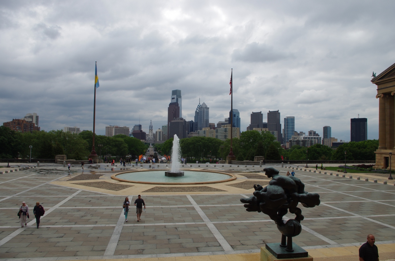 また正面階段を上った美術館の建物の前のスペースからは噴水越しにフィラデルフィアセントラル地区のビル群が見え、なかなかの景色を楽しむことができます。