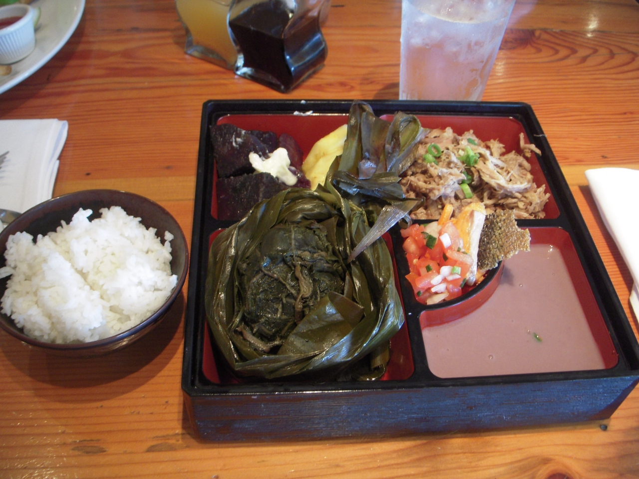 ハワイアンプレートの内容は(Kalua Pig,Lomi Tomato, Hanalei Poi, Pork Laulau, Roasted Okinawa Sweet Potato、Rice)でした。