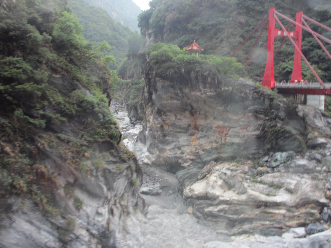 花蓮に行ったら一番楽しみにしていた太魯閣渓谷であったが、あいにく時折激しい雨に見舞われ、危険ということで奥まではいかれなかった。バスの車窓から深い谷間の激流を眺めながら晴れた日の景色を想像していた。大理石がとれるので川の水はいつも白く濁っているとか。