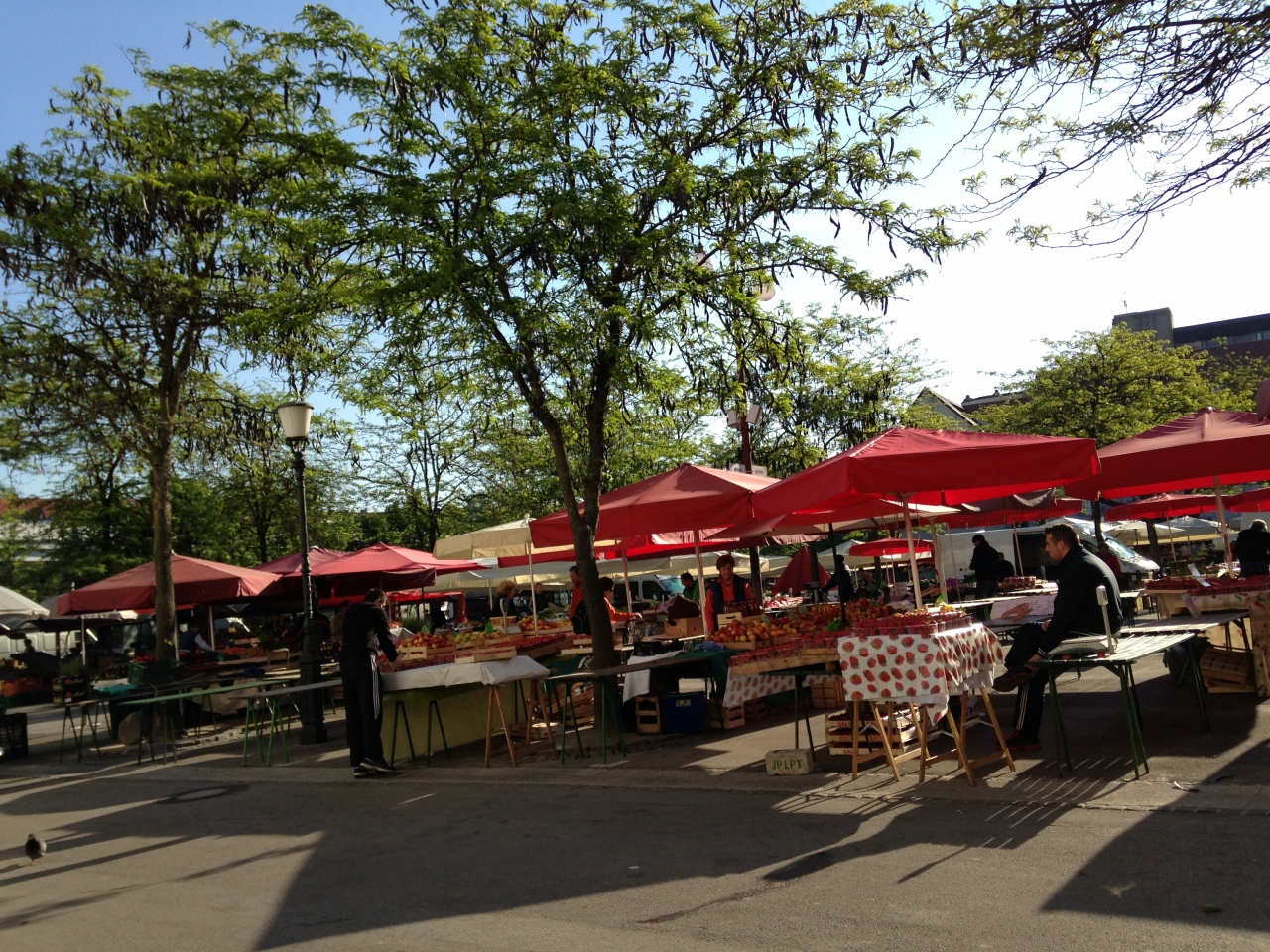 市場の端に牛乳の自動販売機があります。瓶を置いてボタンを押すと牛乳が出てきます。1L瓶用で斬新でした。市場はお花屋さんが多くきれいなブーケが売られていて見るだけでお楽しいです。野菜を扱っている店では店員がブロッコリーをナイフで見事に処理していました。