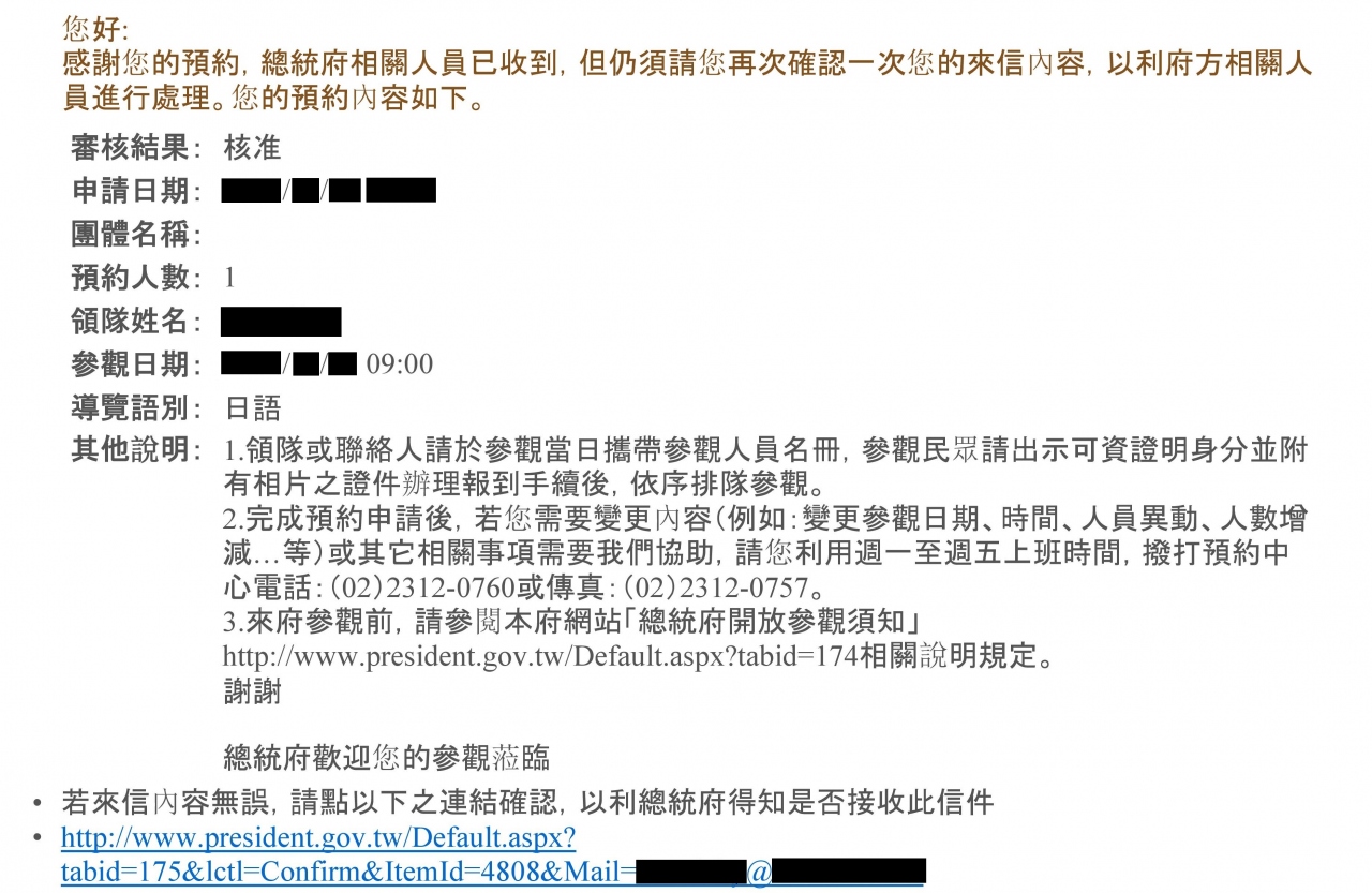 『您己完成予約程序,待府方人員確認後即會發信通知!』