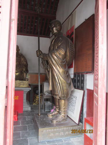 見所は羅漢堂(八角琉璃殿)の中心にある高さ7メートルの全身に金箔が貼られた精緻な千手千眼観音像が安置されている。日本人にとってもゆかりのお寺で、空海禅師の留学先がここです。一番奥に空海大師堂があり、中に空海禅師の立像があります。面白いのは中国の名著「水滸伝」に登場する 魯智深の銅像があります。 参道の左手に木を引き抜く男の像があります。