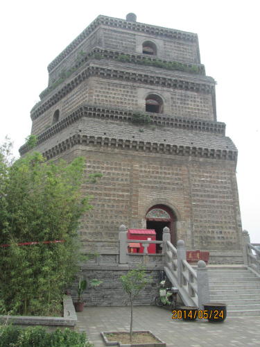 ています。その一つが繁塔で平面六角のレンガ塔は、かつて興塔寺と呼ばれていました。開封に現存する建築物では、最も古い977年(北宋)の建築で、国家級文化財保護単位に指定されています。黄河の氾濫で塔の土台は、地下に埋まり、現在の高さは、36メートルとなっています。もとは9層の塔であったそうだが、現在は3層の塔身に7段の小塔のみが残っています。塔身は、異なった釉で焼かれた四角いレンガで築かれており、一つ一つのレンガに、釈迦牟尼、文殊、普賢、観音、羅漢など様々な仏の姿が彫られ、精巧で、形も鮮明です。