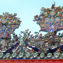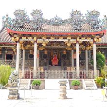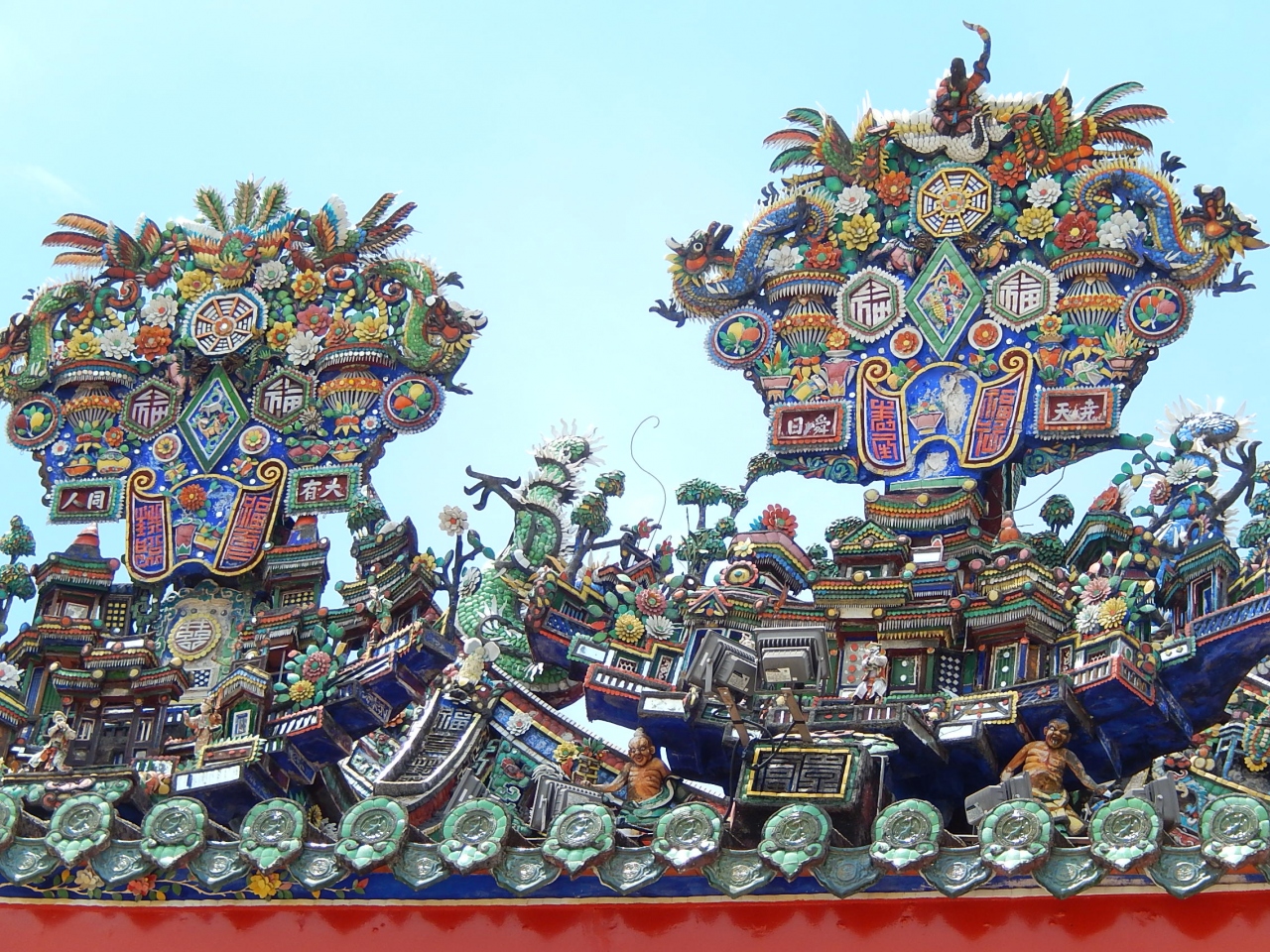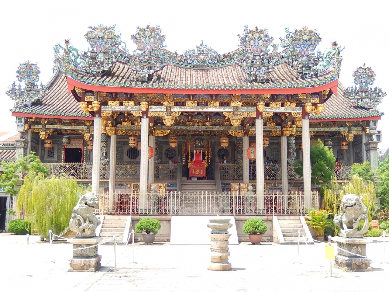 クーコンシーは中国語で「邸公司」と書き、中国福建省からの移民である邱(クー)一族が祖先を祀るために建てた中国寺院だ。歴代の先祖を祀る廟となっていて、お寺と集会場からなっている。1851年に建てられた創建時のものは火事にあい、1902年に再建されたそうだが、屋根には華やかな船の彫刻がのり、内部も細部にいたるまで見事な彫刻がなされている。向かって左側の入り口から集会場に入ることができ、当時の食事風景を人形で再現した部屋を抜けると、建物の詳細を説明したパネルが並んでいる。日本語の解説がないのが残念だった。この前には舞台があり、福建省の歌劇を演じていたが、何分暑いので立ち止まって見る人もなく少々気の毒だった。