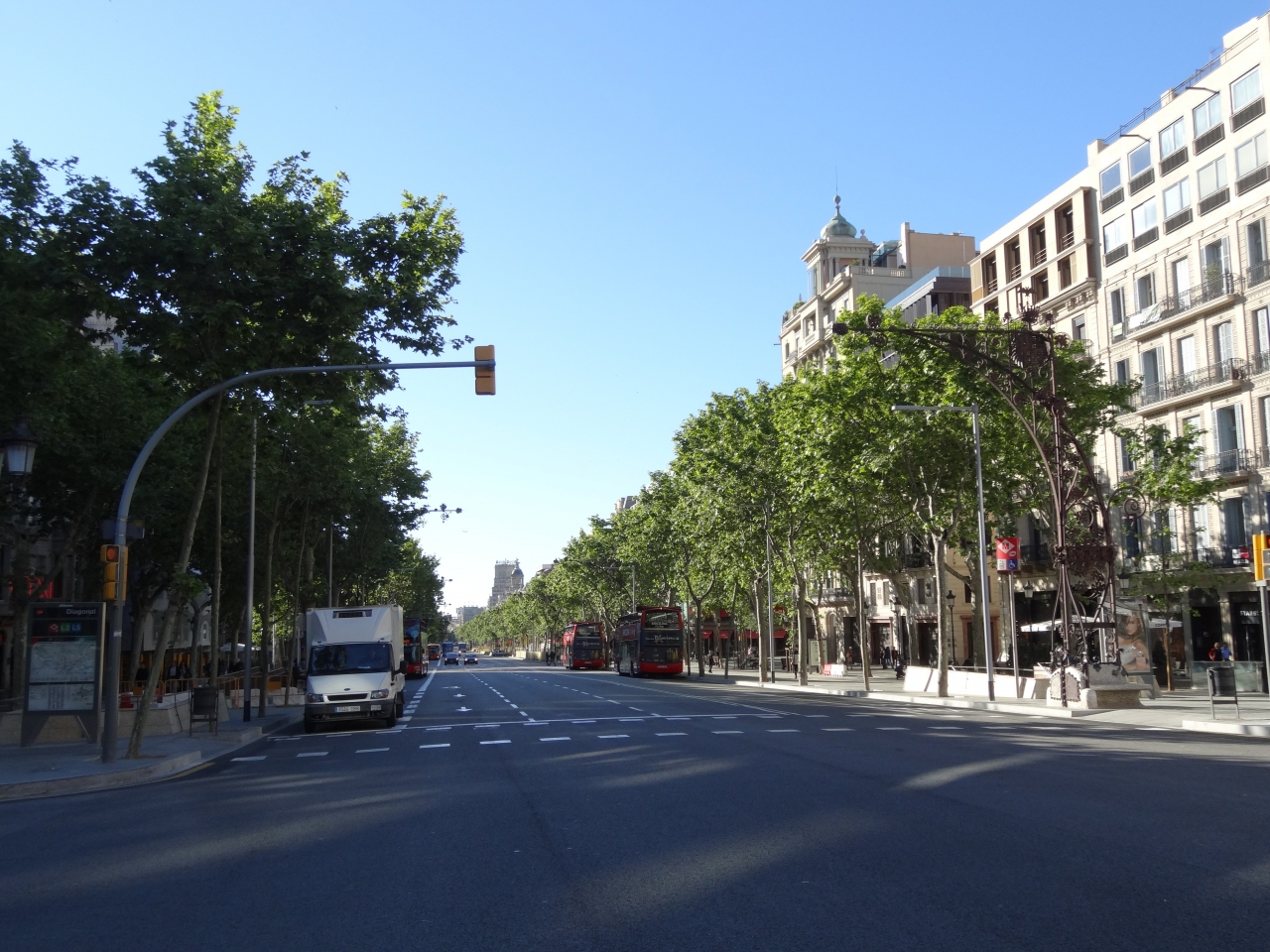 ランブラス通りと違い、普通に道路の左右に通りがありますが、ブランド店やショップ、飲食店が立ち並びます。