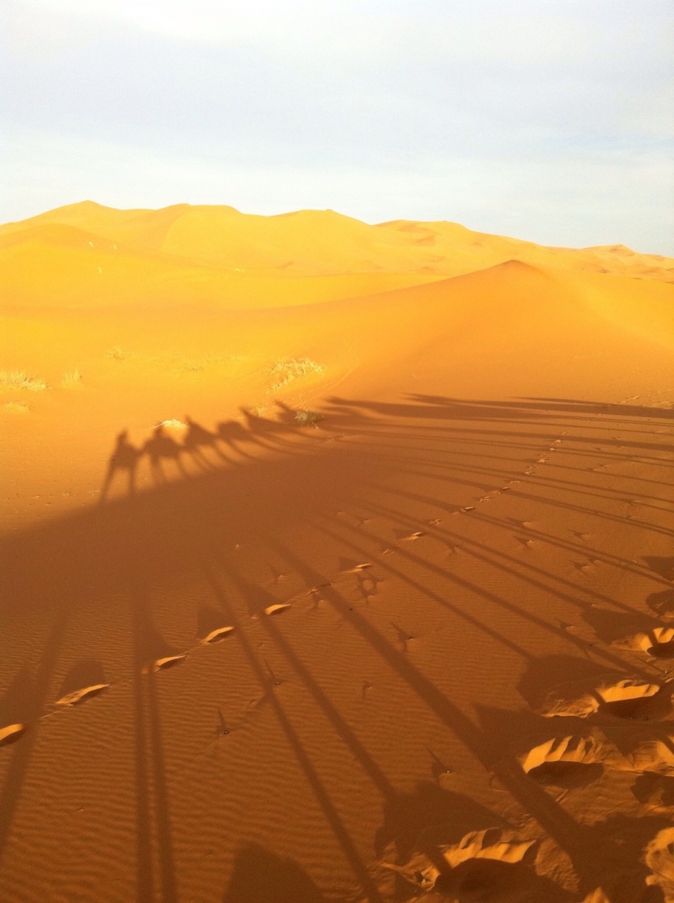 マラケシュから砂漠ツアーに参加しました。ラクダに乗り換え、テントまでひたすらすすみます。見渡す限り砂漠で感動します。夕方になると砂漠に影が移りすてきでした。ラクダの糞はいっぱいありました。テントは意外と広くてトイレもありました。ツアーにはご飯も含まれていたので、砂漠なのにいろいろ食べれました。夜は星がきれいで、日の出もすてきでした。