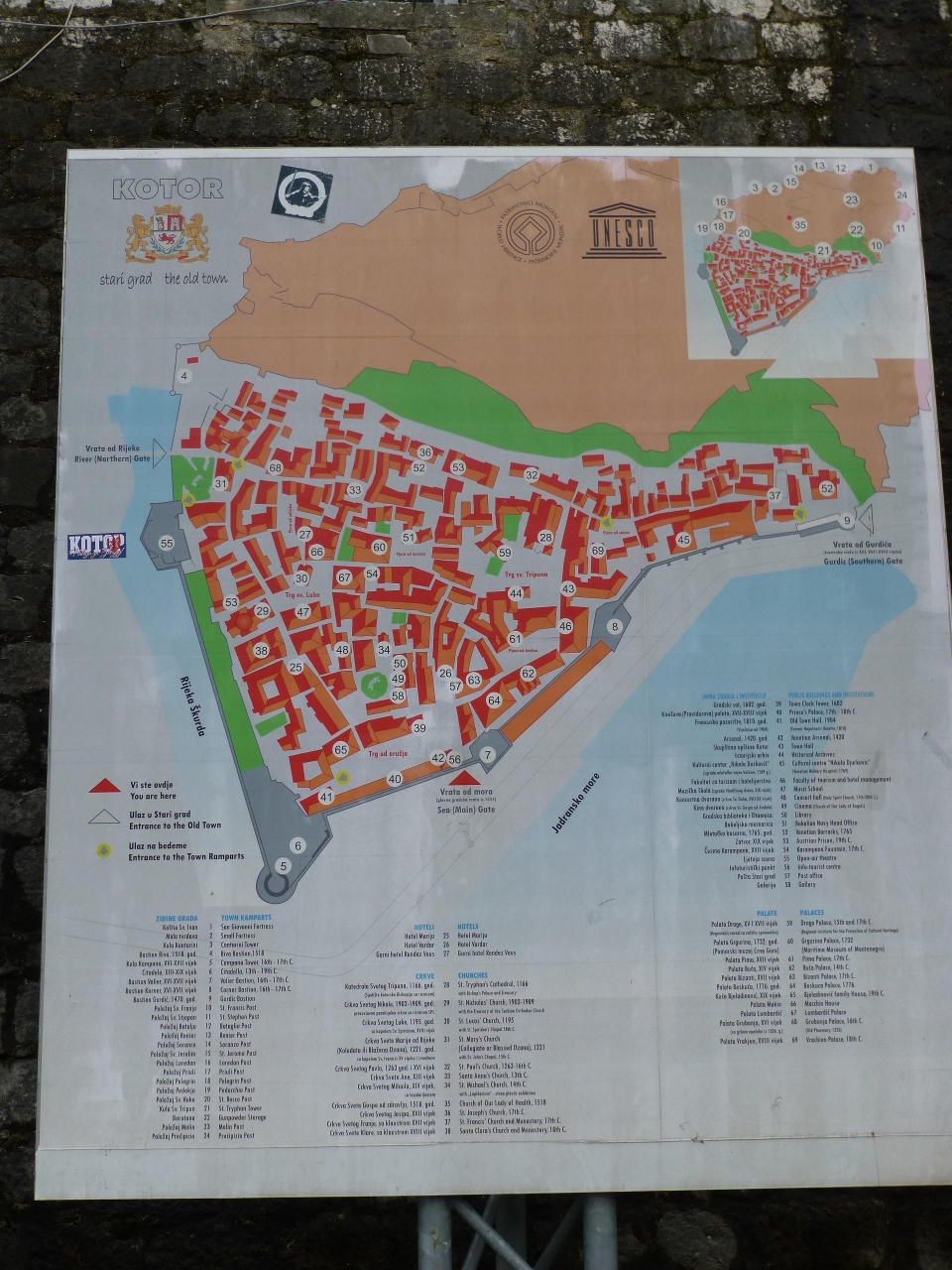 コトルの旧市街はとてもコンパクトにおさまっていて、1時間あれば十分歩いて回れます。また旧市街からは山頂に築かれた救世聖女教会まで登っていくこともできます。ただ、ツアーで参加したので、そこまでは上る時間がなかったので、どれくらいかかるかはわからないです。